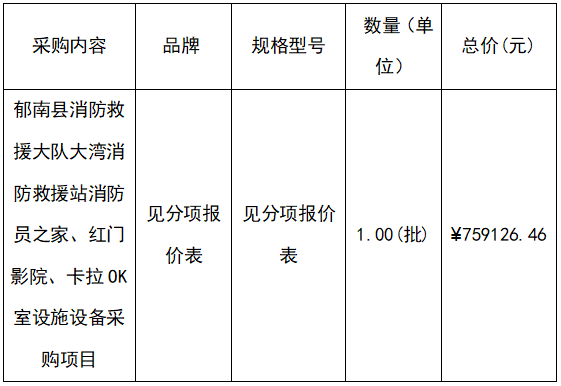 郁南县消防救援大队大湾消防救援站消防员之家、红门影院、卡拉OK室设施设备采购项目成交结果公告