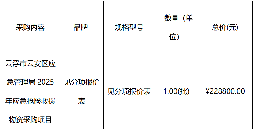 云浮市云安区应急管理局2025年应急抢险救援物资采购项目结果公告